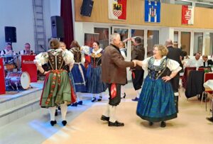Traditionell eröffnet der Egerländer Volkstanzkreis mit zwei Auftritten das Tanzprogramm. Mit „Rosamunde“, der „Fuchsgraben-Polka“ und dem „Schäin Lustig(h“ zeigten die aus den Gmoin Braunfels, Dillenburg und Herborn kommenden Tänzer gekonnt sehenswerte Beispiele des Volkstanzes. Hier bewährt sich die Zusammenarbeit der drei Gmoin im Volkstanzkreis.