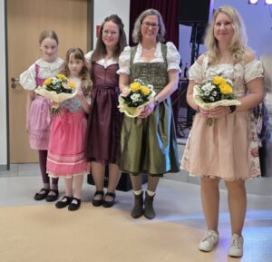 Dreizehn Teilnehmer gab es für die Wahl zur „Miss Dirndl“. Und da die Wahl der Siegerinnen schwerfiel, wurde die Abstimmung per „Applausometer“ durchgeführt. Ein Handy übernahm mittels Schallmessung die Auswertung der Beifallsstärke. Es gab ein sehr dichtes Ergebnis, das salomonisch in der Vergabe von drei ersten Plätzen endete, die jeweils mit einem Blumenstrauß belohnt wurden. Mit einem großen Beifall bedankte sich das Publikum für die tolle Einlage.